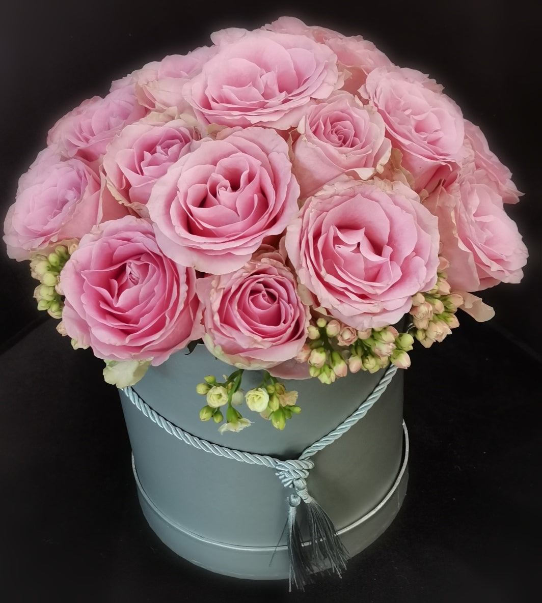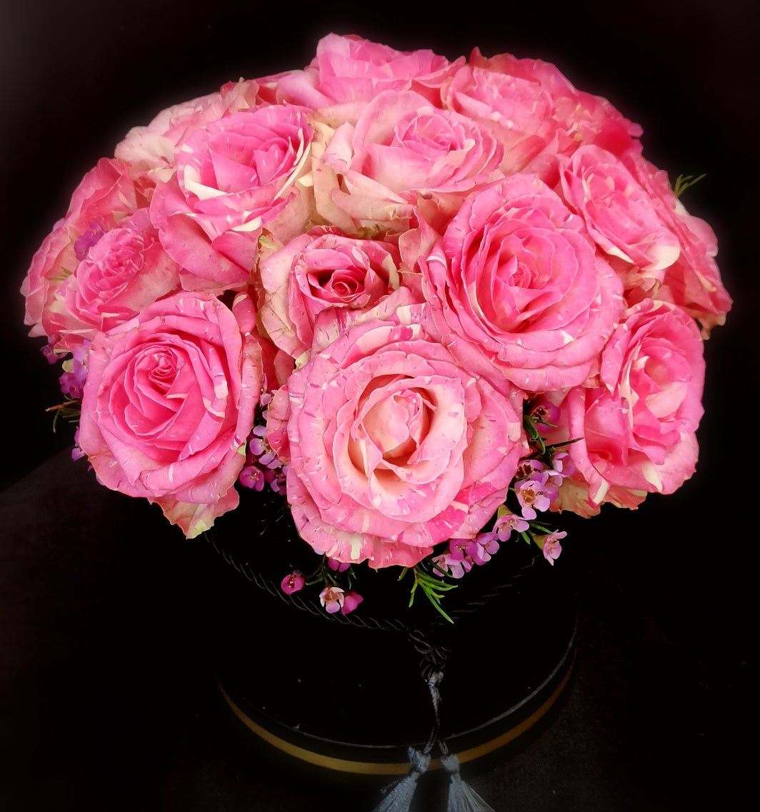 Introducing the elegant Pink/Lavender/Lilac Coloured Hat Box from Caar'i Flora. This sophisticated arrangement showcases a captivating blend of blooms in shades of pink, lavender, and lilac. A luxurious centerpiece that exudes grace and charm, perfect for adding a touch of beauty to any space.