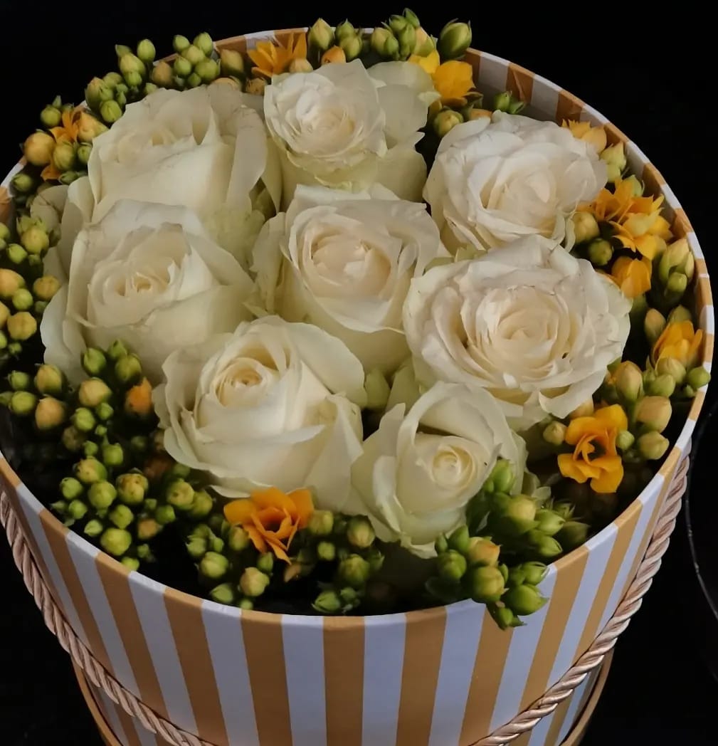 Introducing the elegant White/Cream Coloured Hat Box from Caar'i Flora. This sophisticated arrangement features a stunning combination of white and cream blooms, exuding a sense of purity and refinement. A perfect centrepiece to add a touch of elegance and serenity to any space or occasion.
