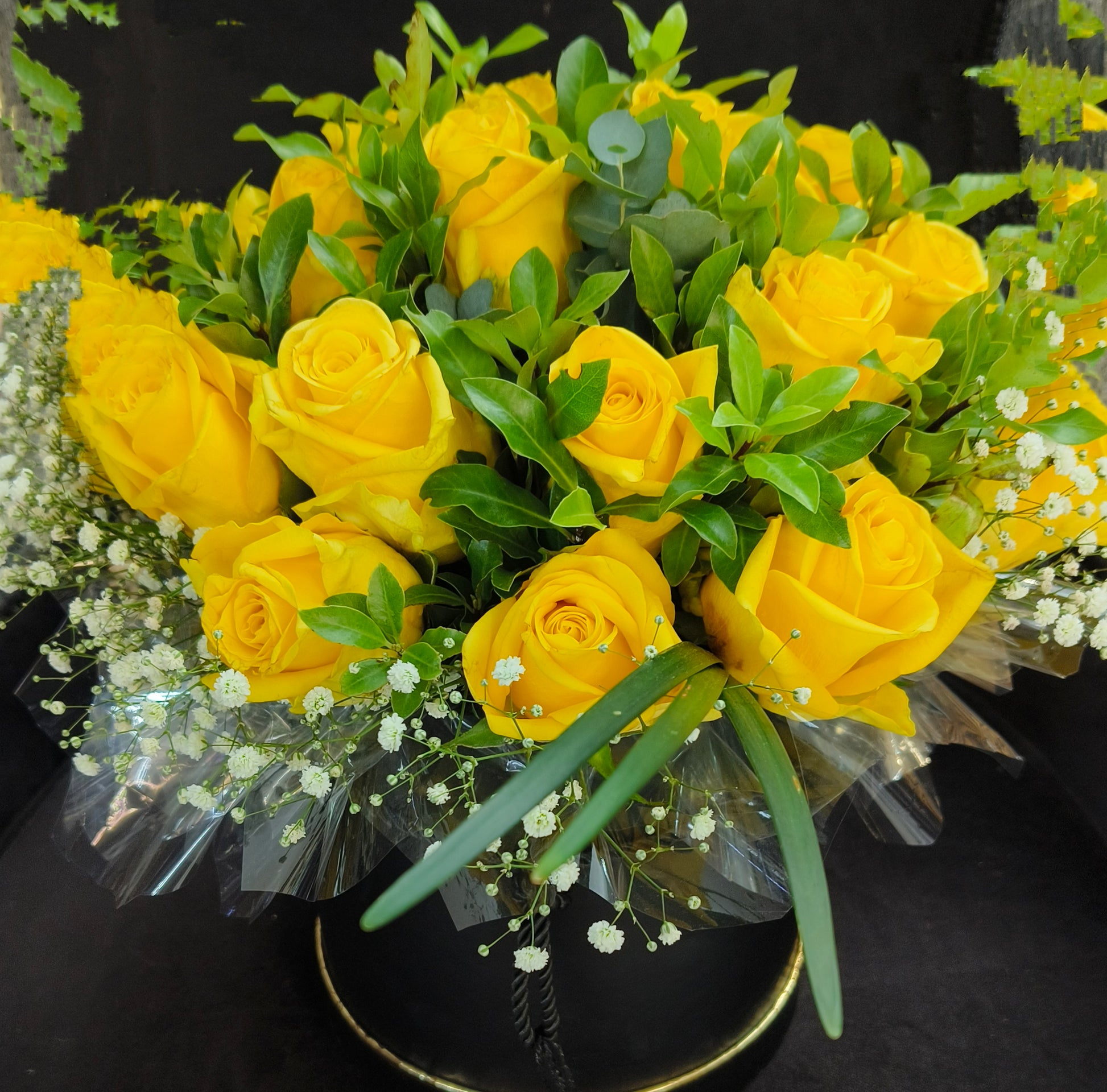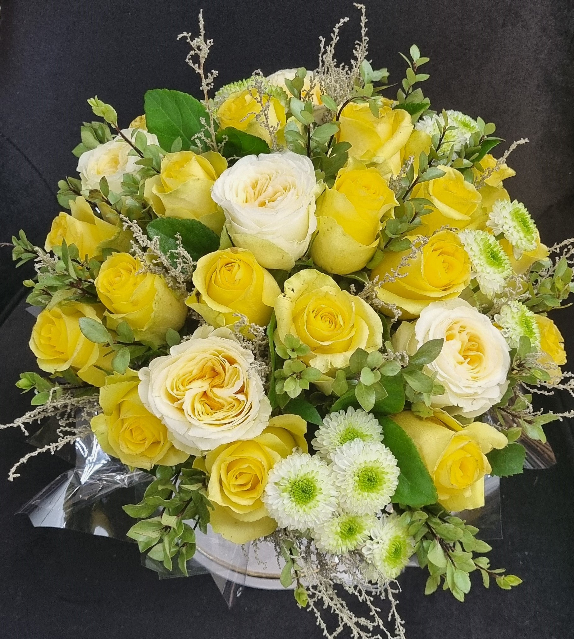 Introducing the vibrant Yellow Coloured Hat Box from Caar'i Flora. This captivating arrangement features a selection of sunny yellow blooms, radiating warmth and joy. It's a perfect centrepiece to brighten any space and bring a touch of positivity and cheerfulness to the surroundings.